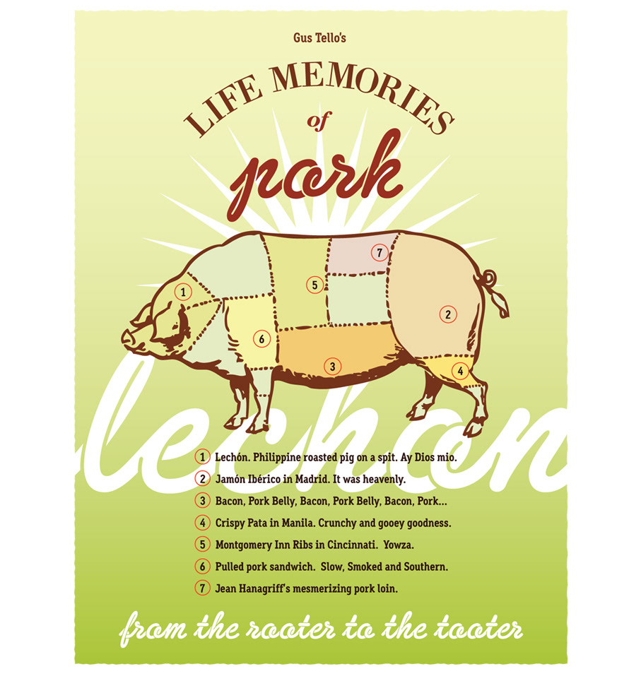 The illustration — Life Memories of Pork — captures a series of culinary recollections, from a childhood in the Philippines, where lechón and other traditional dishes defined moments of family and celebration, to a lasting appreciation for food as a source of connection and memory.