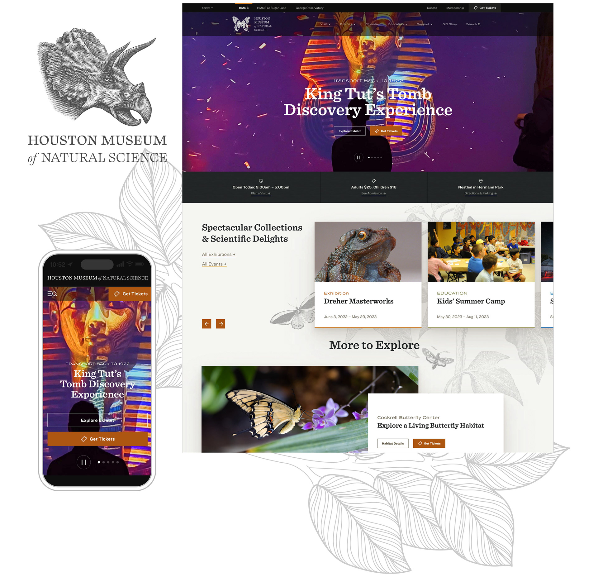 The Houston Museum of Natural Science, one of the nation’s most visited museums, offers exhibitions and programs in science, nature, and culture. With rising mobile traffic and a growing digital audience, HMNS needed a refreshed website to reflect its dynamic offerings and provide easier, more accessible online experiences.